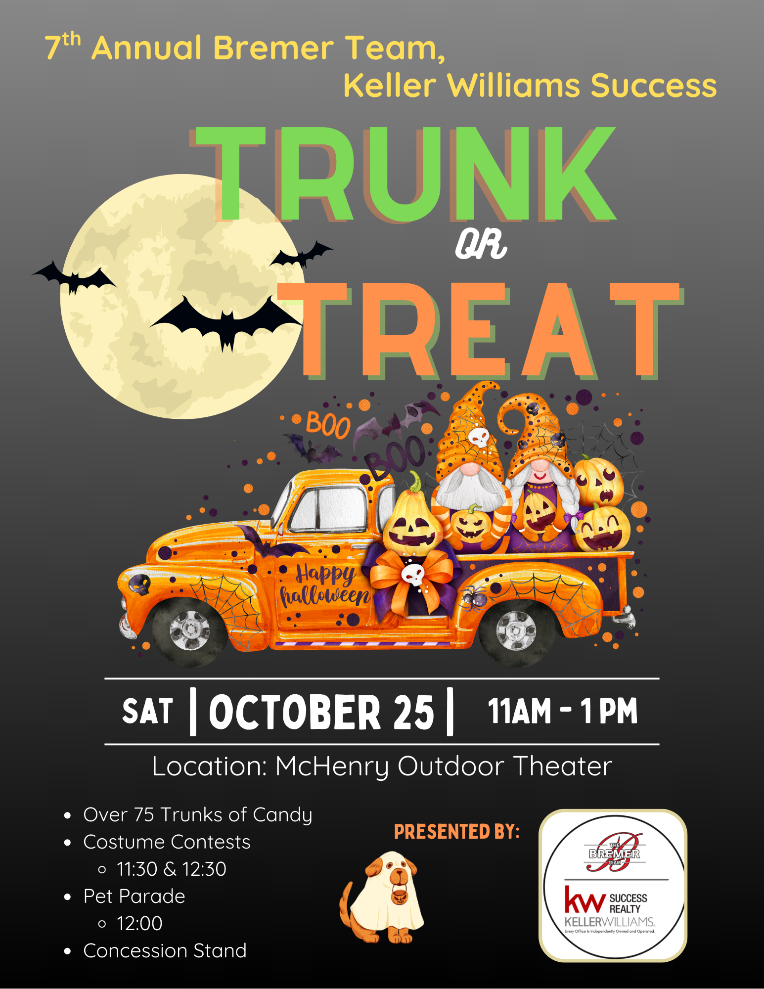 Come find us at the Trunk or Treat hosted by the Bremer Team & McHenry Outdoor Theater! We promise to give out the best goodies to get everyone ready for a great haul of candy going into Halloween! Some tricks and treats and more!